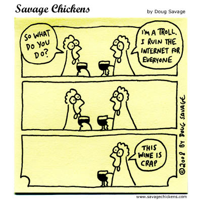 Full disclosure-I troll as a hobby, on places like Yahoo Answers, where I once asked advice on whether a regular bullet would kill a guy I was pretty sure was a werewolf if I shot him before the full moon, since I couldn't find silver bullets.